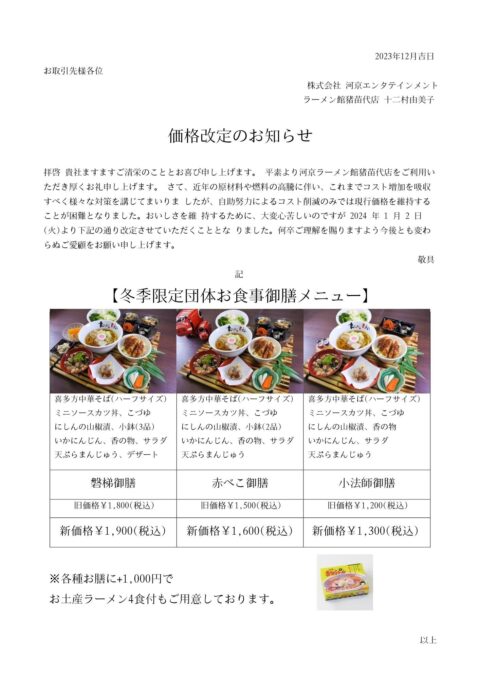 平素より河京ラーメン館猪苗代店をご利用いただき厚くお礼申し上げます。