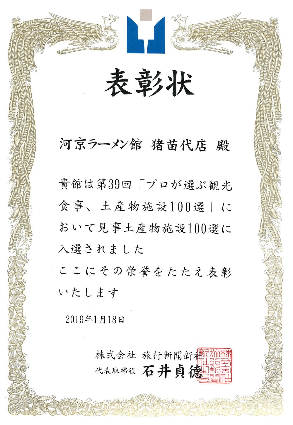 2018年12月発表、第39回「プロが選ぶ観光・食事・土産物施設100選」(主催:株式会社旅行新聞新社)において、