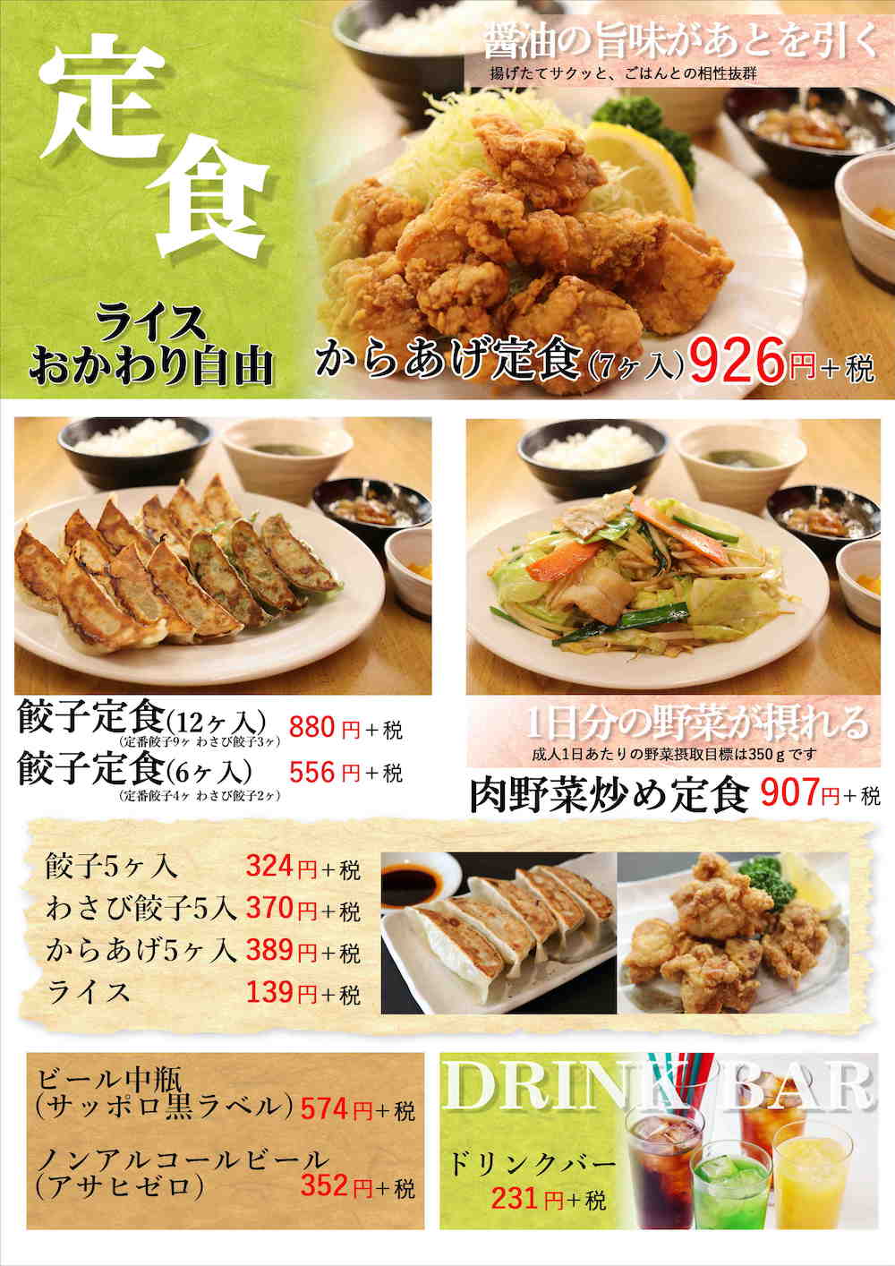 一番人気の喜多方肉中華そばをはじめ、味噌タンメンなどのラーメンはもちろん、肉野菜炒めなどの定食、ラーメンとセットに出来るミニ丼(ソースかつ丼、チャーハンなど)をご用意してお待ちしております。